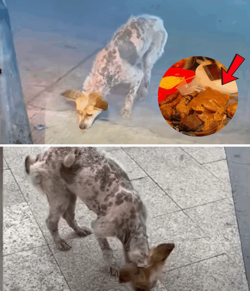At a bustling meat counter, a stray dog stared longingly at the food, his eyes filled with hunger and hope. His body was thin, almost hairless, and covered in patches of irritated skin. Though wary and fearful, he accepted a bag of chicken liver I bought for him, devouring each bite while keeping his distance.