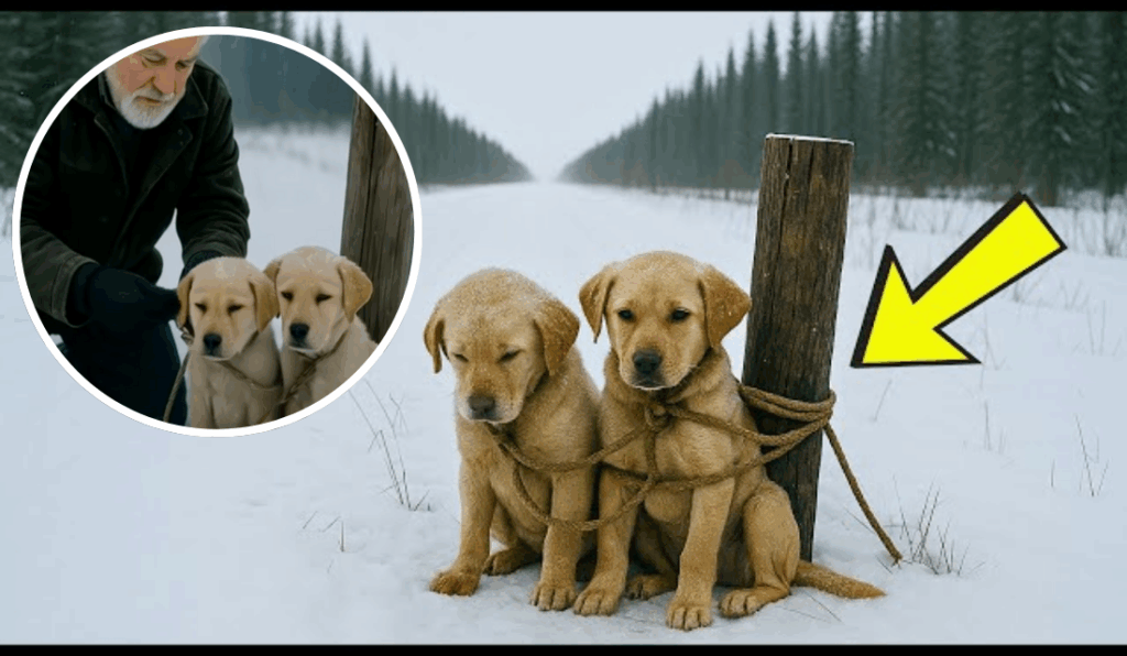 On a remote, snow-covered road in northern Alberta, two tiny puppies were left to die—tied to a wooden stake with no food, no shelter, and only the biting wind and falling snow for company. The person who abandoned them didn’t look back, convinced that no one would ever find them.