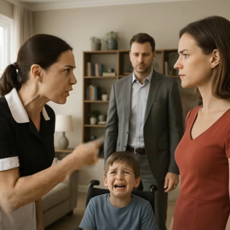 He stopped dead in the doorway. He saw the scene: his sobbing son cowering in his wheelchair, the vile expression on Veronica’s face, and Marina—the quiet new maid—standing defiant against the millionaire’s stepmother.