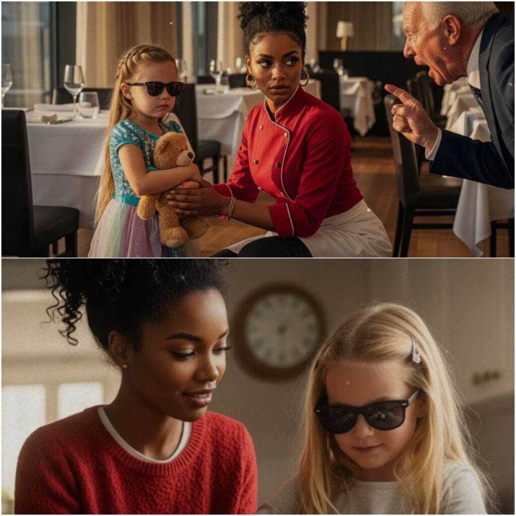 A sharply dressed man stood, finger pointed, his voice rising above the hum of conversation. In front of him, unwavering despite the chaos, was a young Black waitress—Amara Jones. Her hands trembled, but her eyes did not. She stood protectively in front of a small girl with dark glasses and a white cane: Clara, Marshall’s blind daughter.