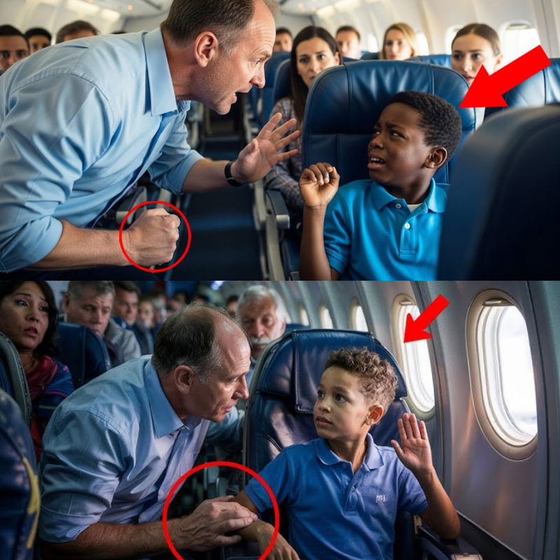 But Clark was already past listening. The storm inside him broke. With a sudden, brutal motion, his fist connected with Keon’s jaw. The sound echoed through the cabin—a sickening thud, followed by the metallic clink of Keon’s tag hitting the tray table. Blood welled at the boy’s mouth, his head snapping sideways against the armrest.