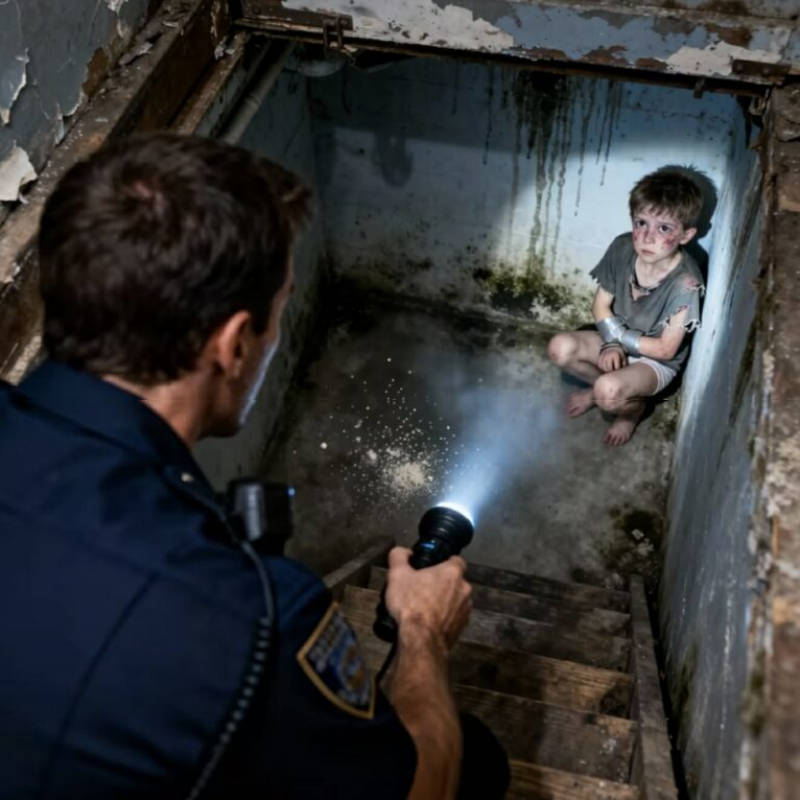 He was small, perhaps seven or eight, though malnutrition had made him fragile. He wasn’t crying, which was the first detail that paralyzed me. His eyes were wide open, staring at the flashlight’s beam with an unnerving intensity. He wore only a thin, tattered shirt, and his skin was covered in dirt, dried blood, and livid bruises.