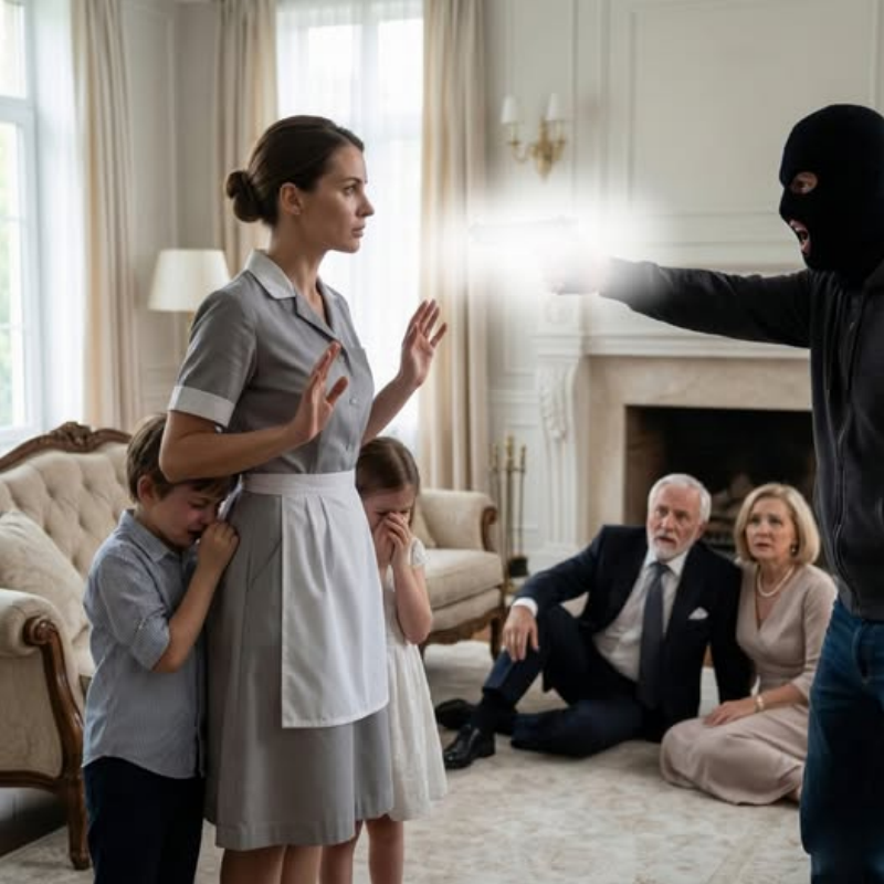 The entire hall watched in stunned silence as the maid, Elara, turned her back on the terrified family, and began to lead the three heavily armed robbers deeper into the labyrinthine shadows of the Sterling mansion. They had chosen the wrong house, and the maid was about to prove exactly why.