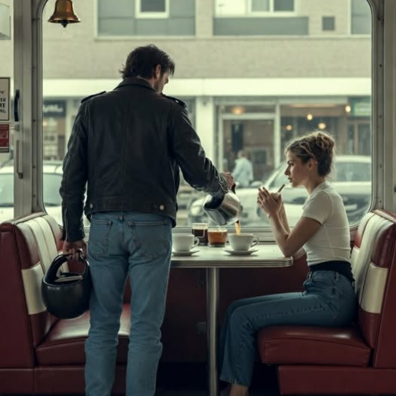 He was a man built of shadow and leather. He didn’t walk; he moved with the steady, heavy gait of someone who had traveled miles of asphalt just to find a place to stop. He always took the window booth, the one where the cracked vinyl bit into the backs of legs and the heater rattled like it was breathing its last.