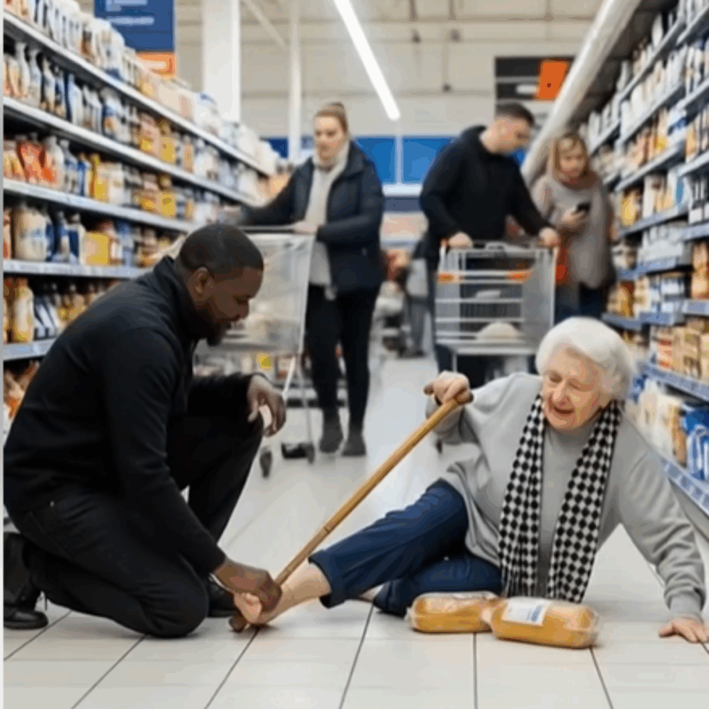 Near the end of the aisle, her frail foot caught on the edge of a floor mat. Pain exploded suddenly, sharp and unforgiving. Her cane clattered to the ground as she collapsed hard onto the cold tile, the impact muffled by the distant hum of activity. Her soft cry was swallowed up, barely registering above the supermarket’s constant noise.