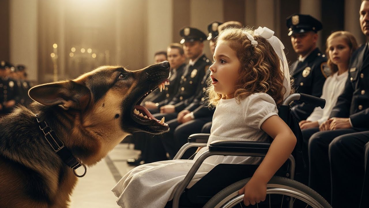 The room was silent. Rows of officers in crisp uniforms, families clutching folded flags, children fidgeting in metal chairs. And then, everything stopped. From the shadows, an enormous German Shepherd stepped forward, his paws echoing softly against the floor. No one called him. No one dared move. Yet every step he took made the air grow heavier. A little girl in a white dress sat frozen in her wheelchair. Her mother’s breath caught. Officers exchanged uncertain glances. The dog didn’t wag his tail. He didn’t blink. His amber eyes locked onto hers like he could see straight into her soul. In that instant, everyone wondered, “What is he about to do?”