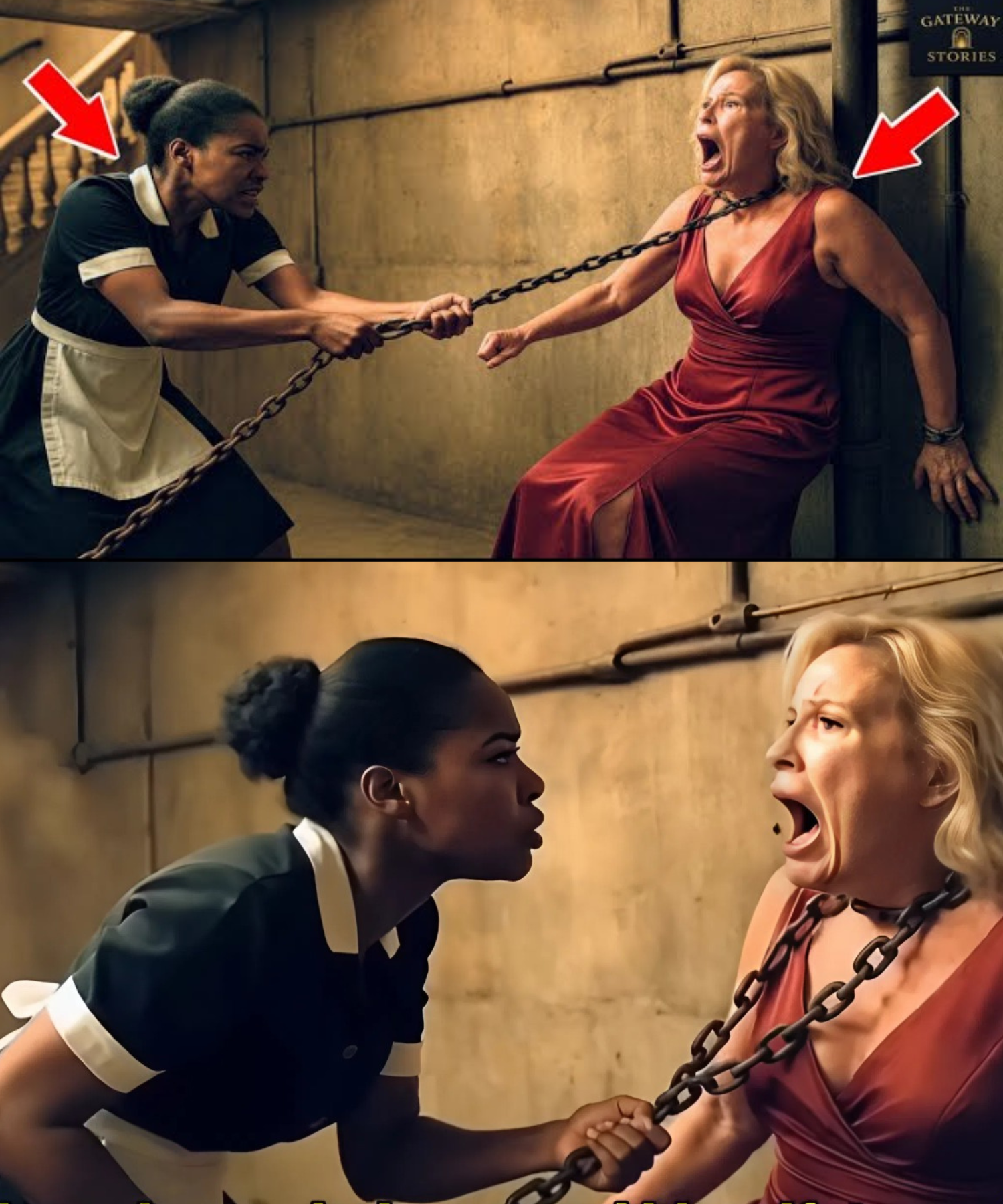 One afternoon, Ethan returned home earlier than expected. As he entered the grand foyer, he heard frantic shouts echoing from the upstairs hallway. Rushing up, he was stunned by the scene that unfolded before him: his black maid, Ruth, was dragging a heavy chain around Margaret’s neck, her face filled with panic and desperation. Margaret struggled, her eyes wide with fear, while Ruth pleaded incoherently.