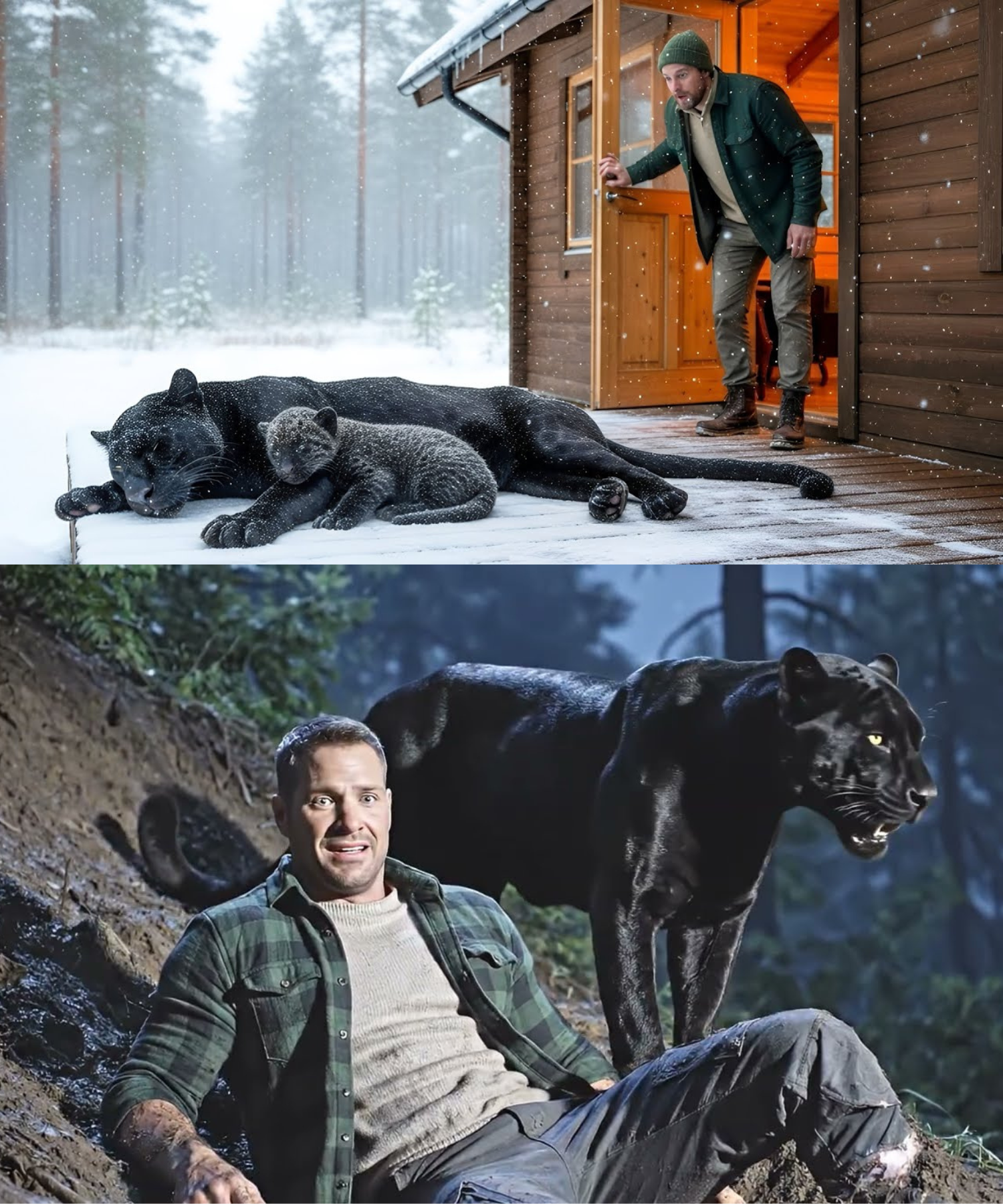 One night, a violent snowstorm struck the region. Power lines snapped, plunging the cabin into darkness and cold. Ethan rushed to check on the panthers, only to find the mother standing protectively over her cubs, her eyes locked on the door. Suddenly, a pack of hungry wolves, driven by the storm, began circling the cabin, their howls echoing through the night.