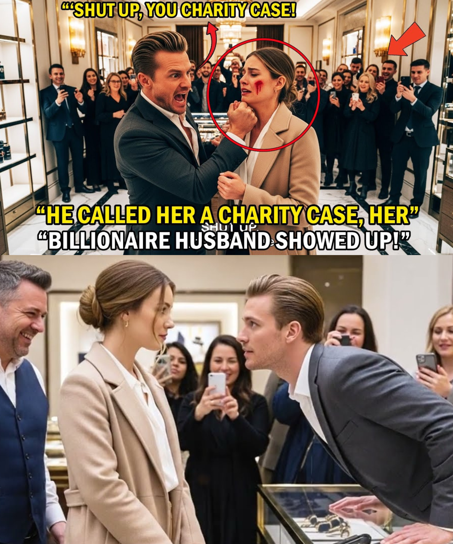 But Victor wasn’t done. As Clara reached for a necklace, he pushed past her, knocking her hand away. “SHUT UP!” he shouted, his voice echoing through the boutique. Then, in a shocking burst of anger, he slapped Clara’s hand aside, causing her to stumble. The store fell silent as everyone stared in disbelief.