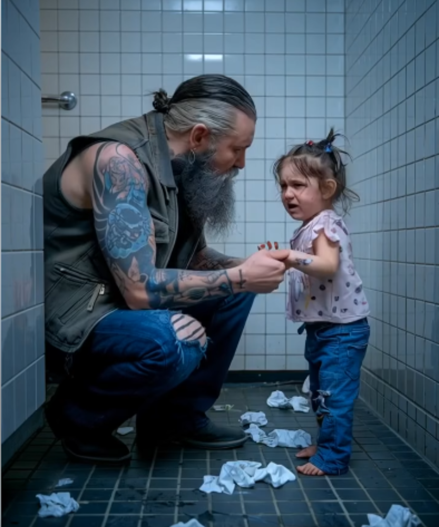 It was close to midnight when Big Mike, a grizzled biker with more years on the road than he cared to count, walked into a quiet fast-food restaurant. He wasn’t expecting anything unusual. But when he pushed open the restroom door, he found a little girl huddled in the corner, shaking, her face streaked with tears. She looked no older than six.