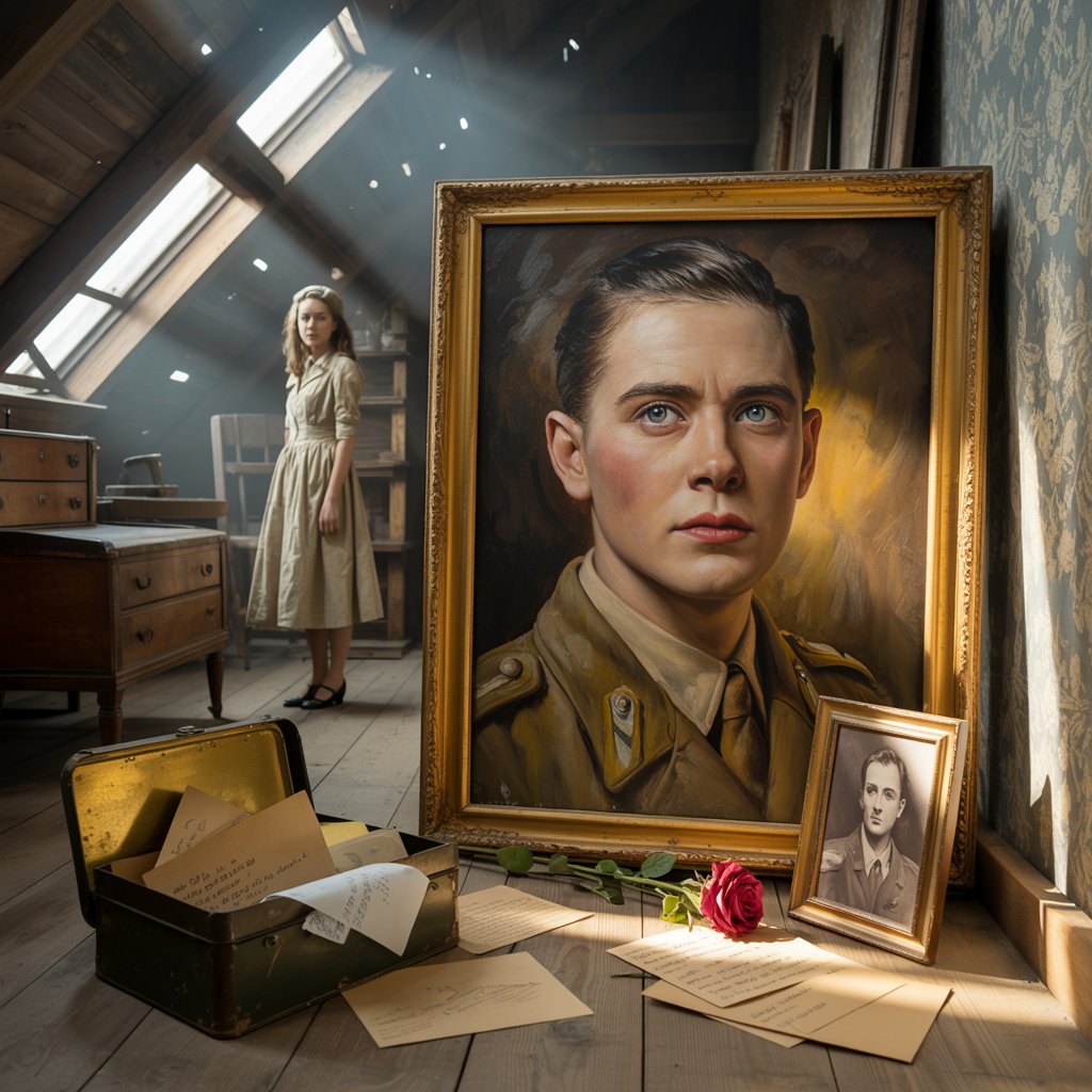 The first time I saw the portrait was in my grandmother’s attic, covered in dust and silence. It was an oil painting — delicate strokes, deep eyes — hanging in a corner where light barely reached. It showed a young man in a World War II uniform, a restrained smile, and eyes so gray they seemed to remember something time had tried to erase. There was no name, only a signature: R.M., 1940. When my grandmother saw me looking at it, she froze. The room filled with a silence that felt like a confession. Then she whispered, “He was your grandfather’s best friend. The only one who never came home.” From that day on, the portrait became part of the house. On rainy afternoons, when the wind rattled the windows, I sometimes thought the young soldier blinked, or that his shadow moved. Grandma avoided talking about him, but I knew his story was hidden in the letters she kept inside a tin box under her wardrobe. Years later, after she passed away, I inherited the house — and the portrait. That’s when I finally opened the box. Inside were eleven letters, all addressed to the same man: Captain James Parker. Each was signed with the same initials from the painting: R.M. The early letters spoke of war, fear, and youth lost to duty. But as they went on, the tone shifted. They became more intimate, more desperate. The last one, dated April 1939, felt like it came from another world: “I’m not afraid to die, James. What terrifies me is becoming a fading memory on the lips of the living. If I return, it’ll only be in paint. If I don’t, promise you’ll remember me as I am now — with a smile untouched by endings.” The letter was stained — maybe by tears, maybe by mud. It was never delivered. Beside it was a note in my grandfather’s handwriting: “Buried on Hillcrest Hill. No name. Promise kept.” That’s when I realized my grandfather had painted the portrait himself — fulfilling his vow to immortalize his fallen friend. What I didn’t understand was why he’d hidden it all his life. A month later, while restoring the painting, I noticed something odd beneath the varnish — brushstrokes that didn’t belong. I took it to a restorer. When he carefully removed the upper layers, another figure appeared: the same soldier, but with a young woman beside him — my grandmother, smiling. The restorer looked at me in silence. He didn’t need to say a word. I suddenly understood what my grandfather had buried — not just a friend, but the truth. She had loved him first, before the war took him away. My grandfather, the survivor and the witness, had sealed that truth beneath paint — a quiet act of redemption… or jealousy. That night, I hung the portrait in the living room. For the first time, the soldier’s eyes seemed at peace. I watched until dawn, when the sunlight revealed something I’d never noticed — carved faintly into the back of the frame: “Don’t forget me.” Every year since then, on the day of his death, I place a red rose beneath the portrait. No one in town understands why. Some think it’s superstition. Others say it’s love. But I know the truth: the portrait keeps what war could not erase — the memory of an impossible love, a promise unfulfilled, and the silence of what was never said.