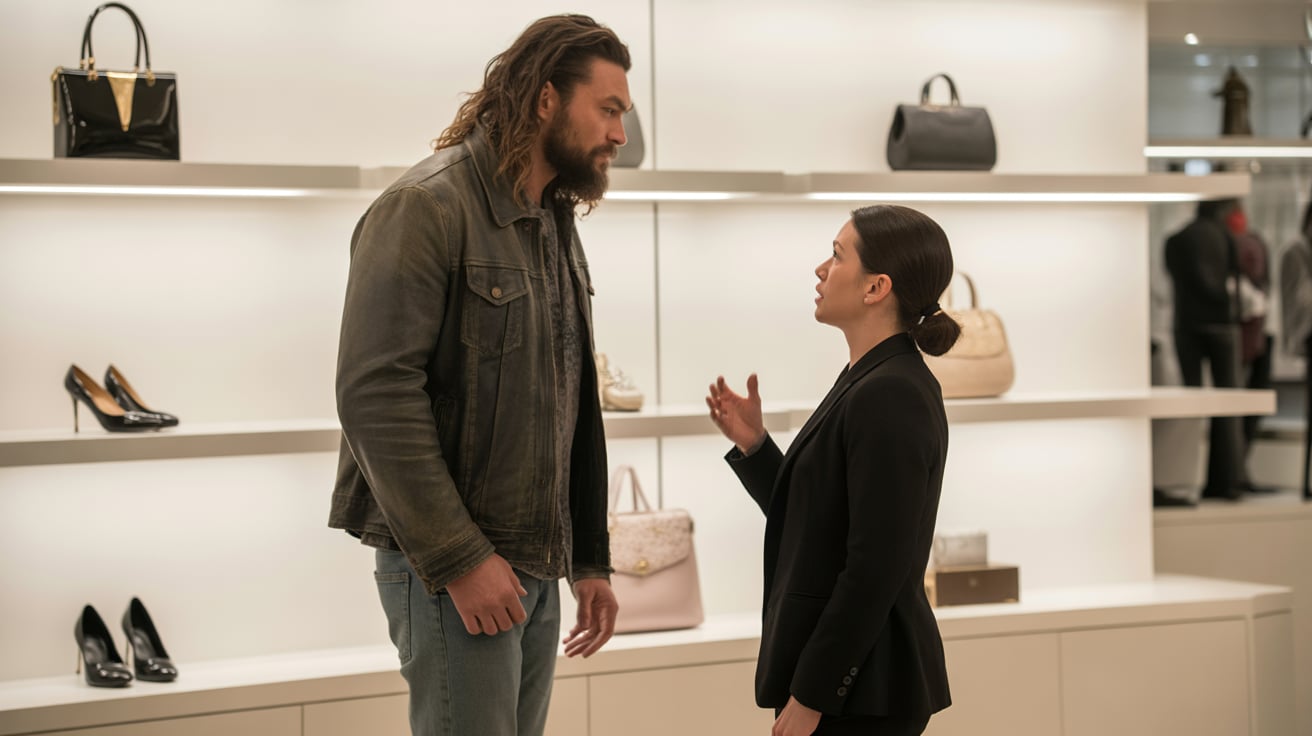On a chilly afternoon in downtown Los Angeles, Jason Momoa, the renowned actor known for his roles in blockbuster films and television series, found himself wandering into a high-end luxury boutique called Lux Emporium. Unlike many Hollywood stars, Jason preferred to blend into the background, often dressing in casual attire that didn’t scream celebrity. On this day, he wore a simple pair of jeans, a black leather jacket, and his signature scuffed boots, exuding a charm that was both approachable and unassuming.