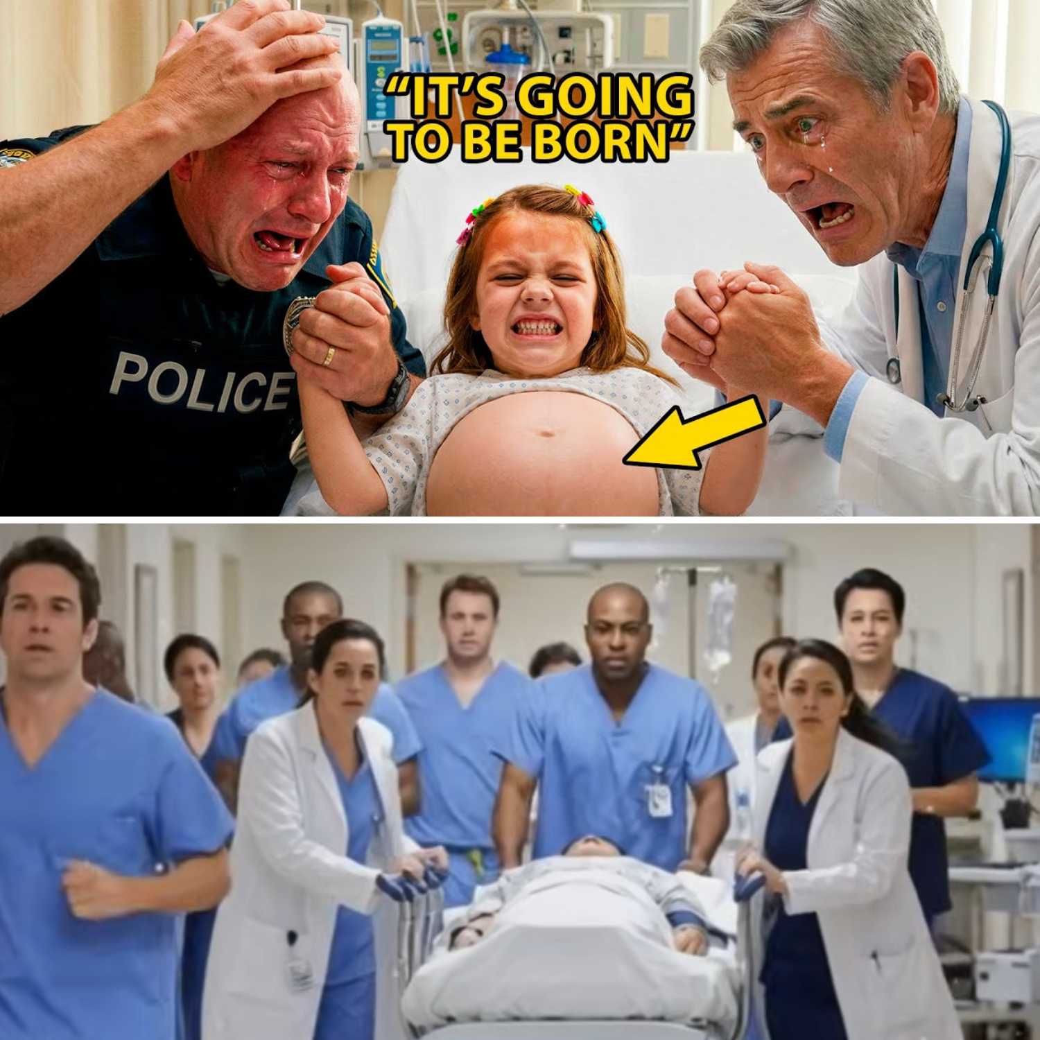 She was so small she looked closer to three than five, her feet bare, clothes dirty, hair tangled. But it wasn’t her appearance that froze every nurse in the room—it was her belly, swollen and distended, and the words she screamed with a terror that cut through the morning calm: “It’s coming! The baby is coming!” Dr. Ward dropped his clipboard. Nurse Denise Matthews rushed with a wheelchair, hands trembling. Behind the child stood Officer Ethan Graves, a local cop known for his steady nerves. Today, his face was pale, eyes red—he looked like a man haunted.