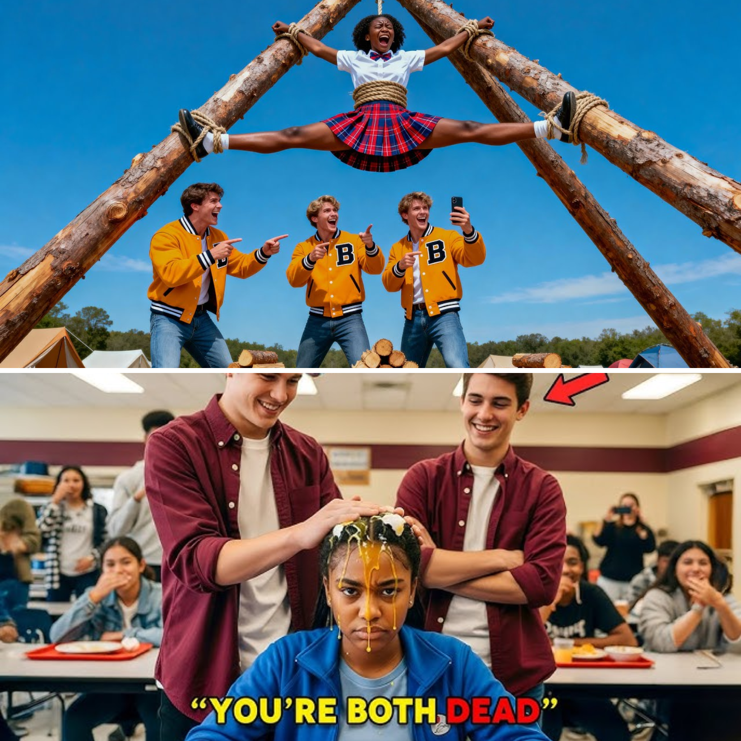 “You’ll always be less, black girl. You’re nothing but entertainment for people like us.” The words dripped from Braden Mercer’s mouth as he yanked Aara’s arms wide, stringing her up like an animal beneath the old oak tree, wrists and ankles bruised raw by coarse rope. The once-proud honor student, now a living, breathing warning, hung powerless before the sneering crowd. Not a single soul dared to step forward—until a furious voice thundered through the chaos, shattering the silence. What started as a lone act of courage sparked an unstoppable uprising, exposing the machinery of power that shielded monsters in school ties.