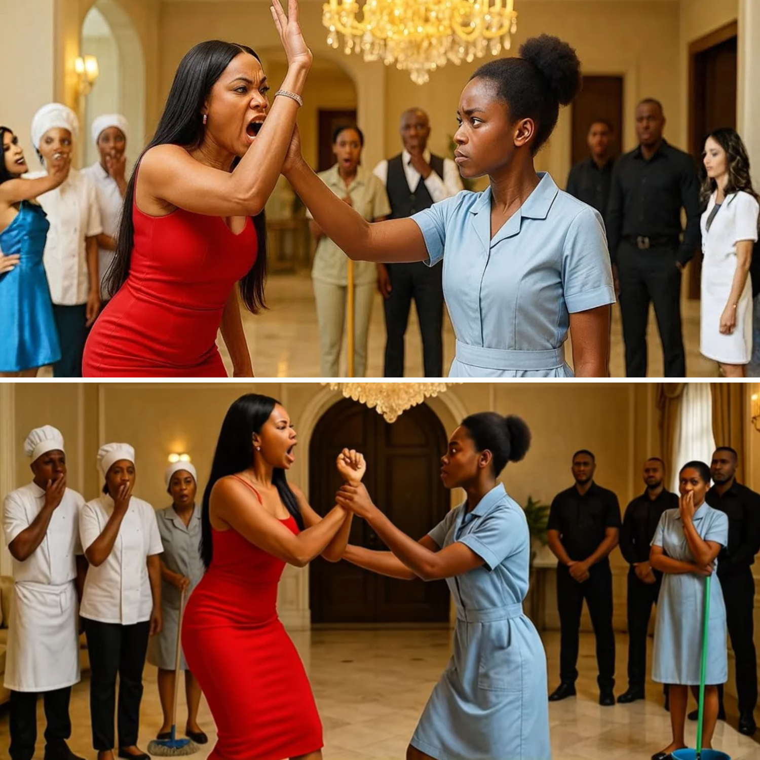 Clarissa’s diamond bracelet went missing, and as always, suspicion turned to the staff. She stormed into the living room, her rage volcanic. “Who touched my things?” she screamed, slapping one maid, shoving another, raining insults on everyone. Then she spotted Amaka. “You! New girl! Did you touch my bracelet?” “No, ma,” Amaka replied, voice calm but unwavering. Clarissa’s eyes narrowed. “You dare talk back?” She raised her hand, ready to strike.