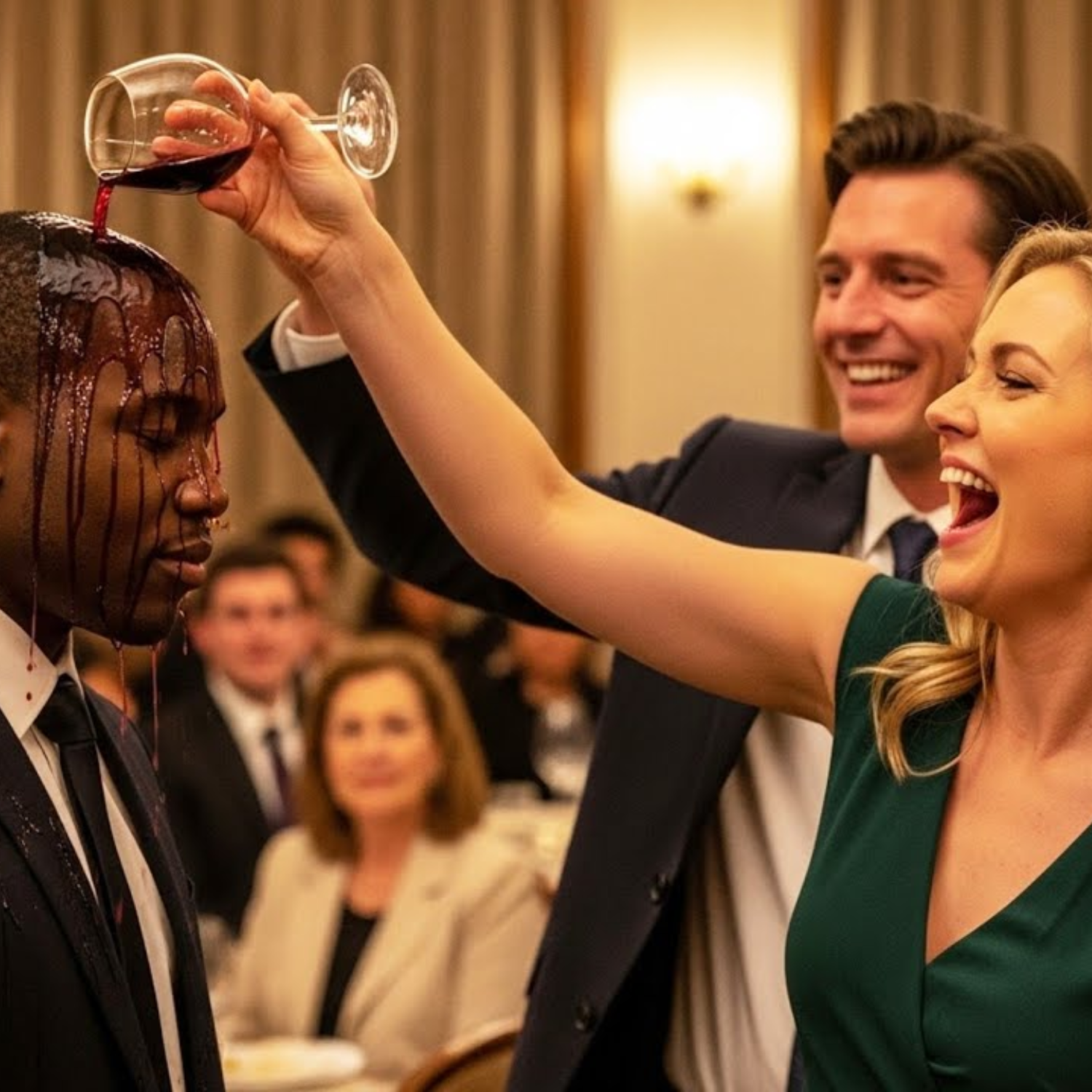 As Jamal drifted near a column, Vanessa spotted him. Her smirk was slow and deliberate. She whispered to Richard, and he approached Jamal with forced charm. “Sir, are you supposed to be standing here?” he asked, tapping Jamal’s sleeve like he expected him to flinch. Jamal’s reply was soft: “I am fine here. Just observing.” Richard chuckled, snapped his fingers at a server, and mocked Jamal’s suit. Guests whispered, “Who let him into VIP?” Vanessa approached, heels clicking, and handed Jamal a glass of wine, telling him to take it to table three. When Jamal didn’t comply, Richard grabbed the glass, raised it for the crowd, and dumped the wine on Jamal’s suit. Gasps cut through the room; phones recorded. Vanessa laughed. “Maybe now he knows where he stands.”