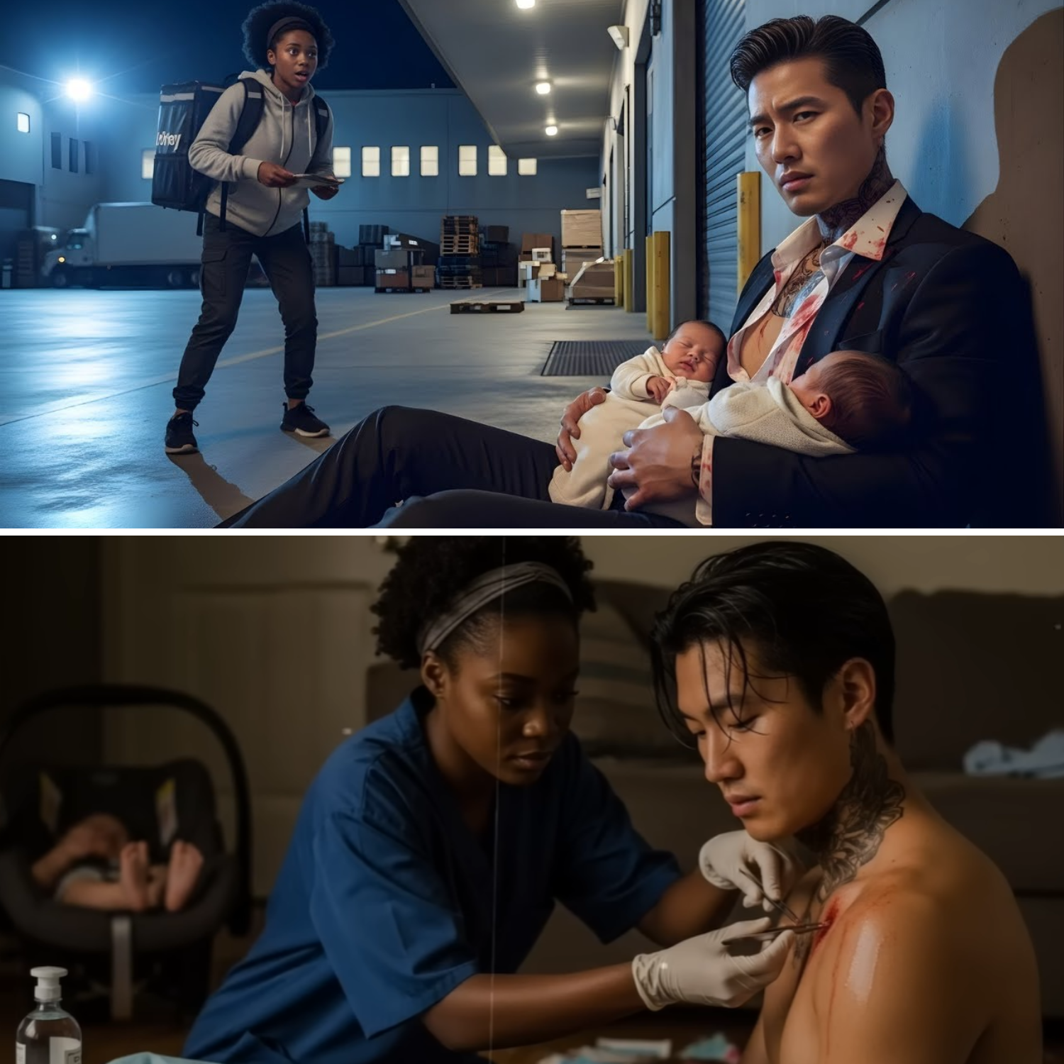 There, slumped against the brick wall, was a man—his expensive suit stained with dark blood, a gun clutched in one hand, and two infant car seats beside him. The sight was surreal, a stark contrast between the luxury of his attire and the grim reality of his situation. The babies, mere months old, were crying, their faces contorted in distress. The man’s dark hair was matted with blood, and his eyes, filled with pain, locked onto hers.