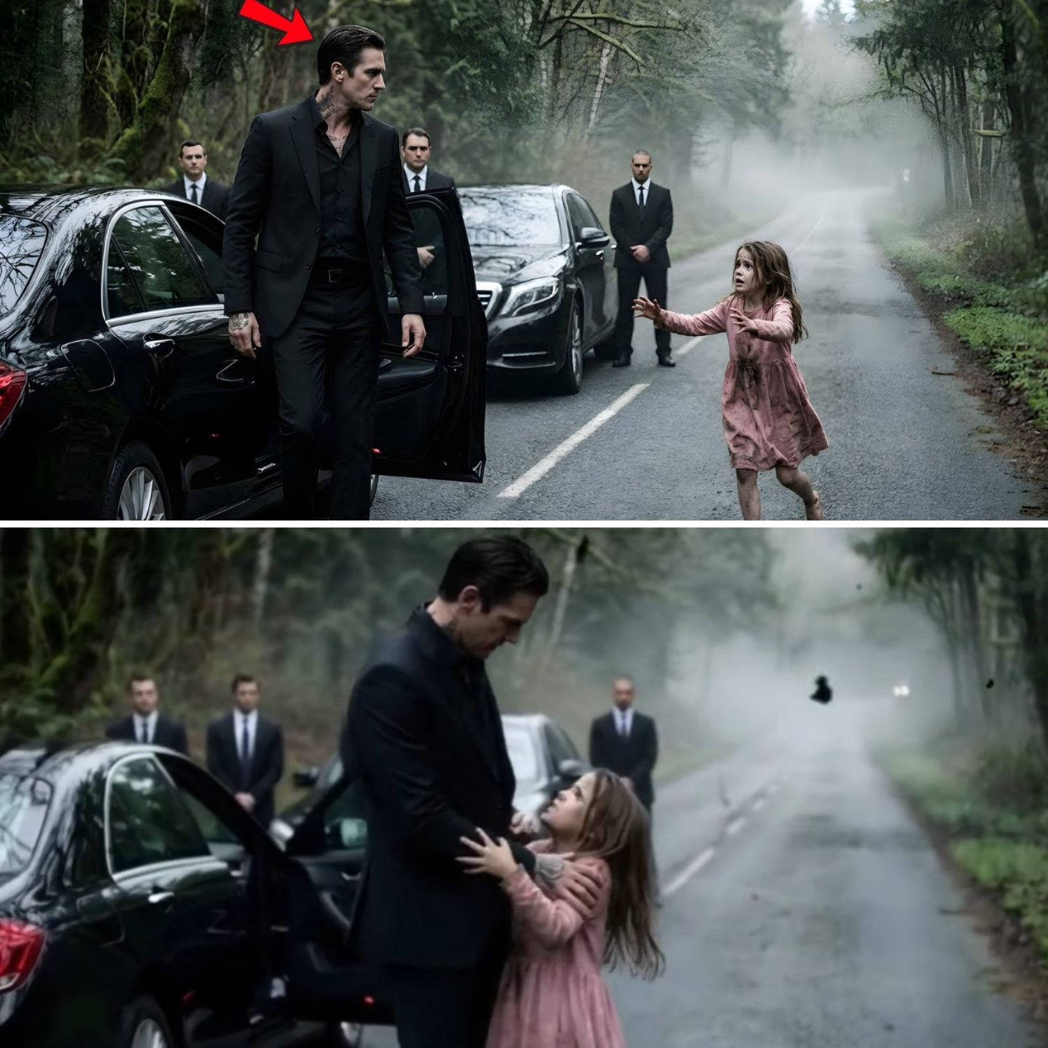 The fog rolled in thick that morning, swallowing the forest road in gray, muffling sound, turning the pines into shadowy sentinels. Nothing moved—until a little girl burst from the mist, barefoot, dress torn, blood streaking her legs. She ran like the devil was behind her, arms pumping, breath ragged, leaving a trail of bloody footprints that vanished into the gloom. When she saw the convoy of black luxury cars blocking the road, she didn’t hesitate. She ran straight for them, screaming: “Help! Please, someone help!” The lead car’s door opened. Out stepped a man in a black suit, tattoos crawling up his neck, eyes cold as midnight. Ramon Ortega. A name that could clear a street or fill a grave. His men—real killers, not bodyguards—fanned out, hands near their guns. The girl collapsed at Ramon’s feet, sobbing, “They hung my mom on a tree. Please, you have to save her!” She didn’t know she was begging a cartel kingpin. She only knew she needed a monster to fight monsters.